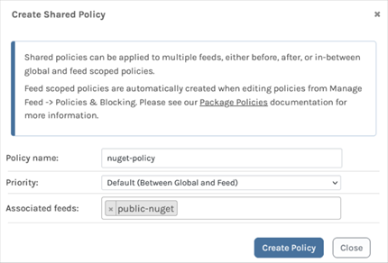 Sometimes you might need to block a license only being used by packages in a particular feed. In this case, you can block licenses at feed-level by creating a “Shared” policy.