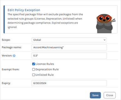 You may also want to create an exception just for a limited time, such as for internal packages (MyCompany.*) or version ranges where metadata is known to be incorrect. In these cases, you can also set an expiry date.
