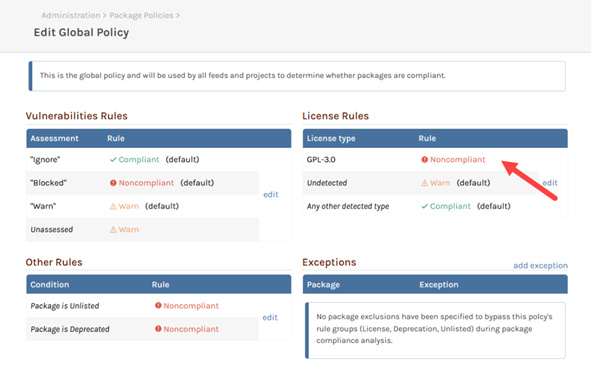 Licenses assessed as “⚠ Noncompliant” may be considered acceptable in some cases. To allow certain packages with these licenses you can create exceptions, much like the “Ignore Rules” in Artifactory.